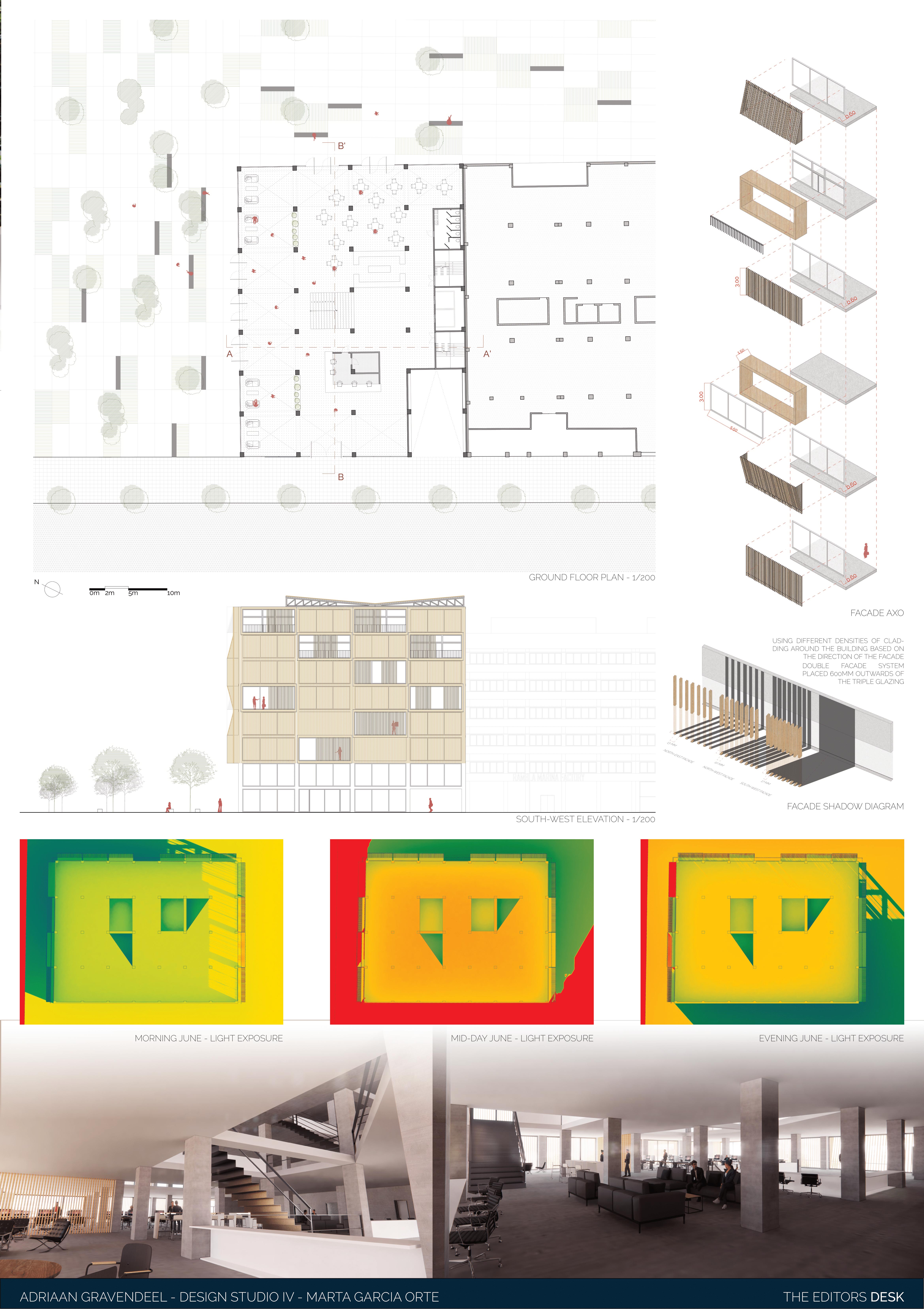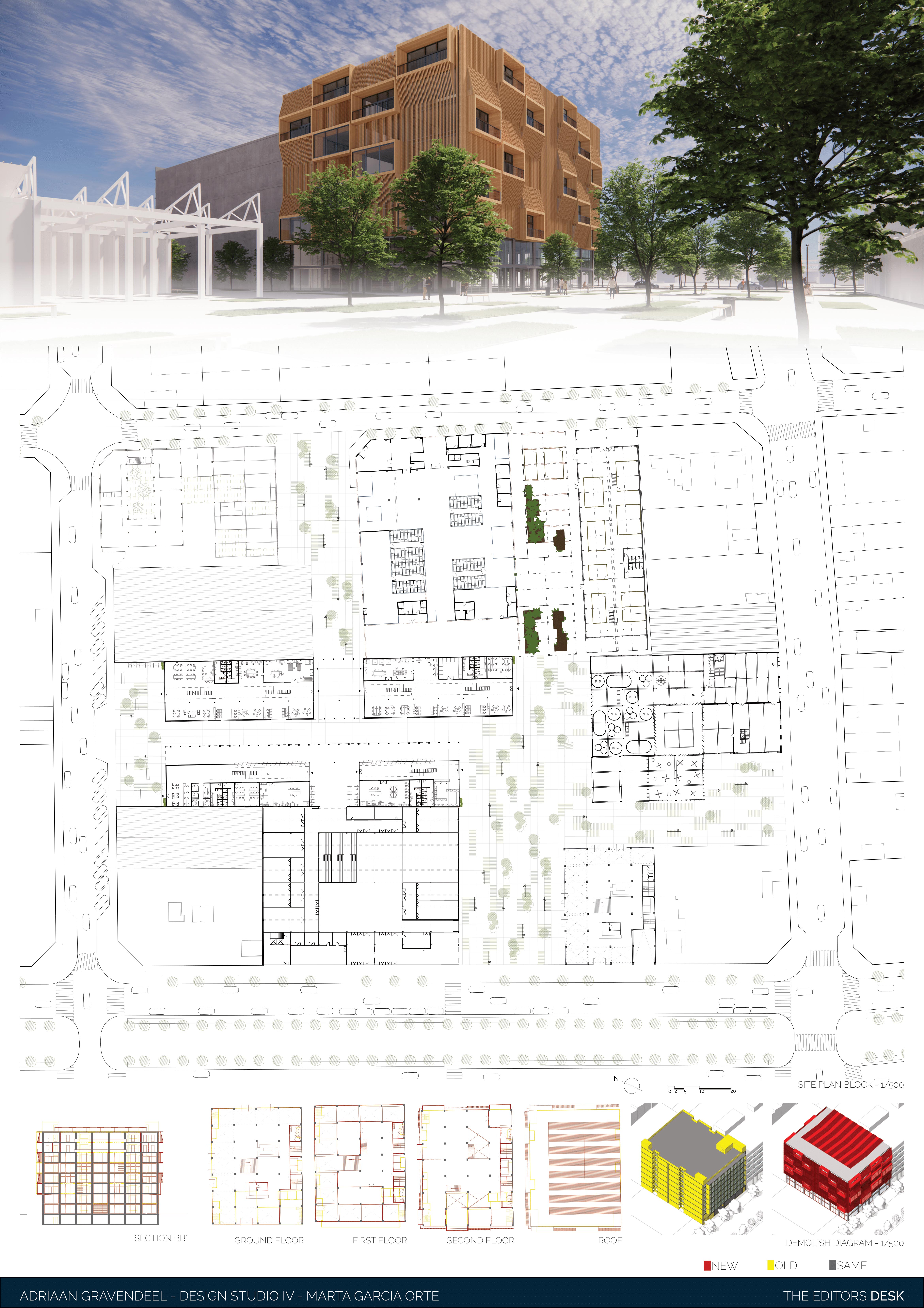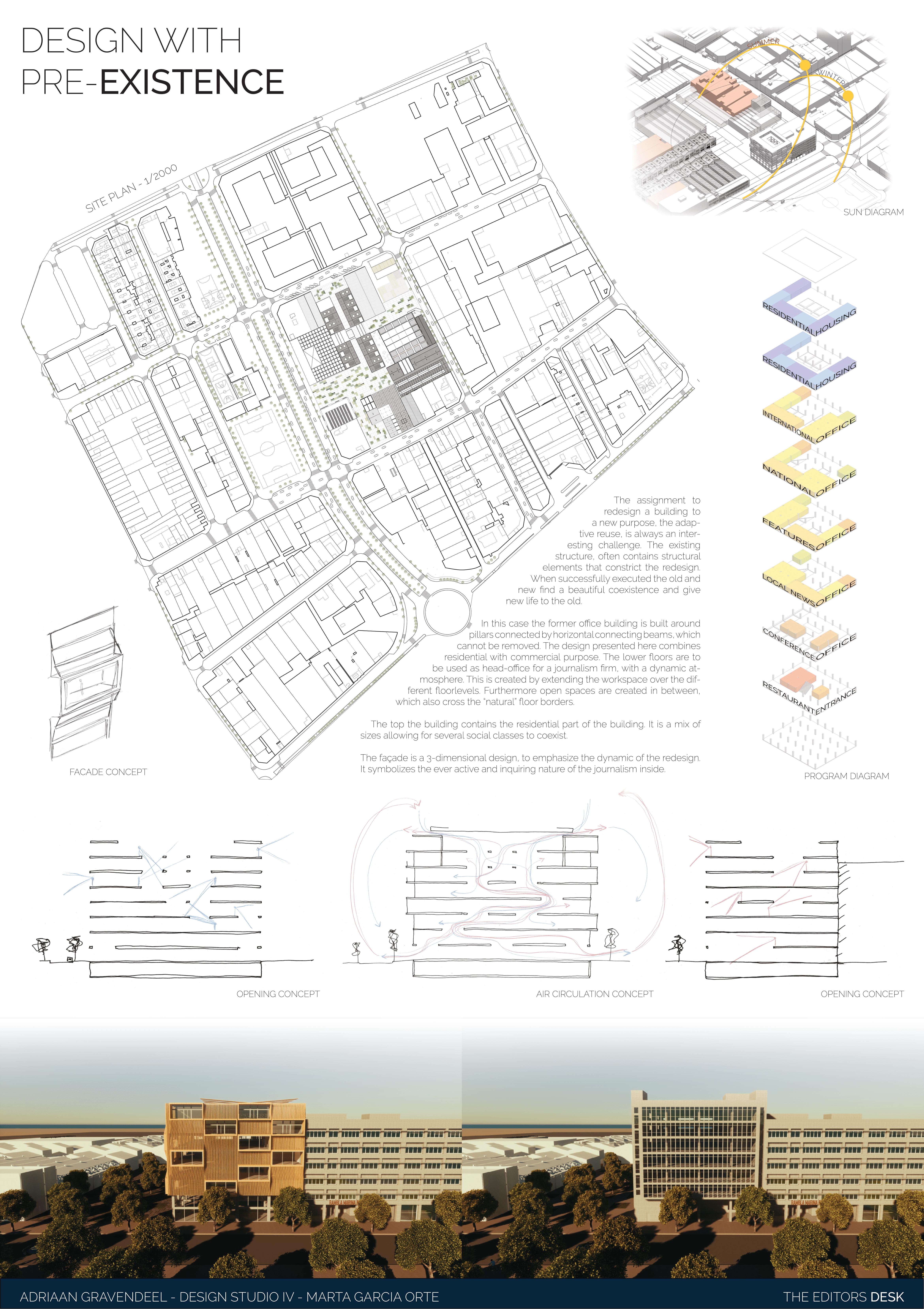 The assignment to redesign a building to a new purpose, the adaptive reuse, is always an interesting challenge. The existing structure, often contains structural elements that constrict the redesign. When successfully executed the old and new find a beautiful coexistence and give new life to the old. In this case the former office building is built around pillars connected by horizontal connecting beams, which cannot be removed. The design presented here combines residential with commercial purpose. The lower floors are to be used as head-office for a journalism firm, with a dynamic atmosphere. This is created by extending the workspace over the different floorlevels. Furthermore open spaces are created in between, which also cross the “natural” floor borders. The top the building contains the residential part of the building. It is a mix of sizes allowing for several social classes to coexist. The façade is a 3-dimensional design, to emphasize the dynamic of the redesign. It symbolizes the ever active and inquiring nature of the journalism inside.