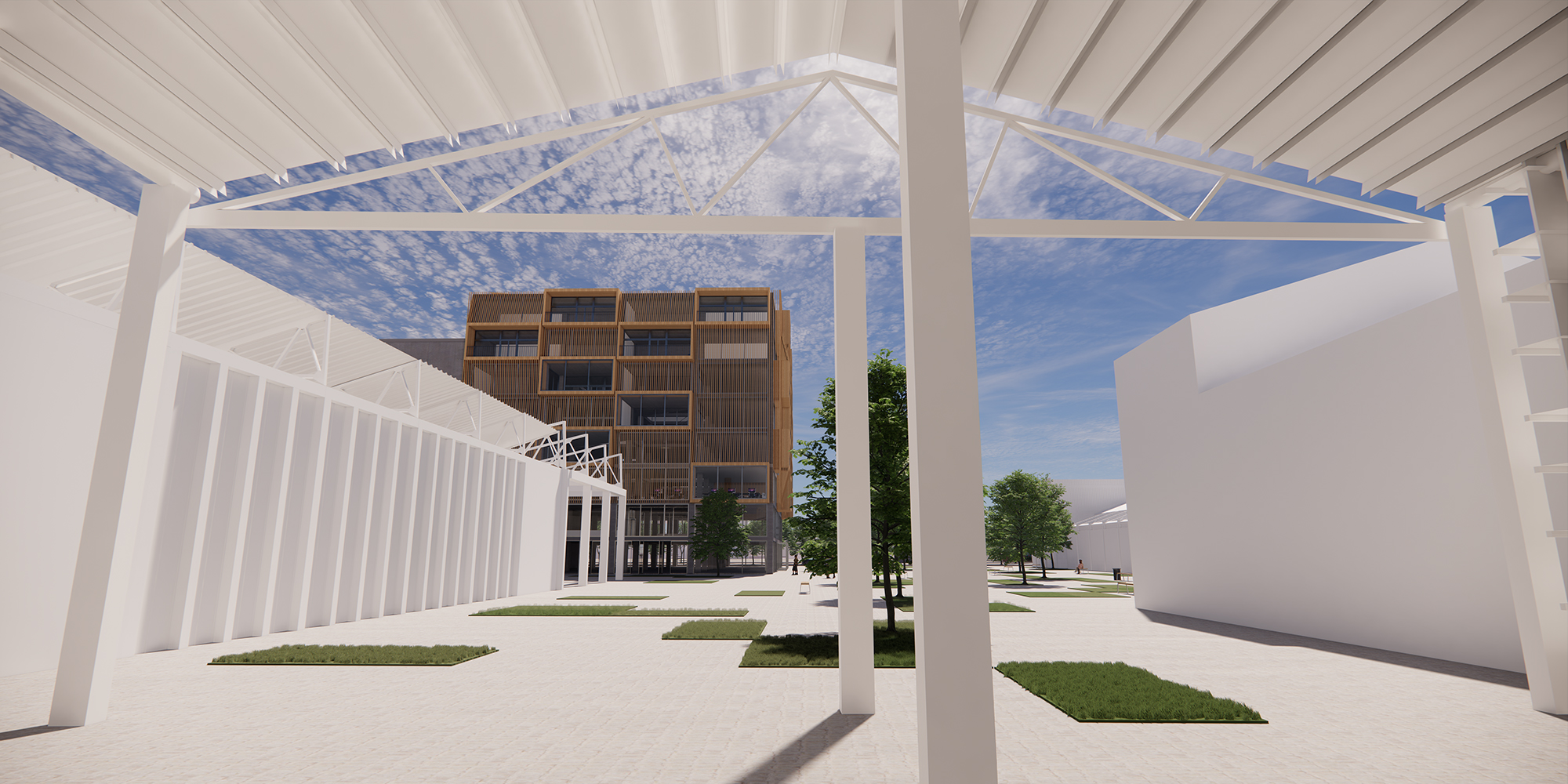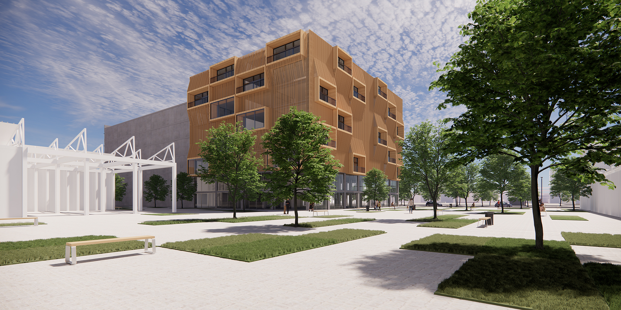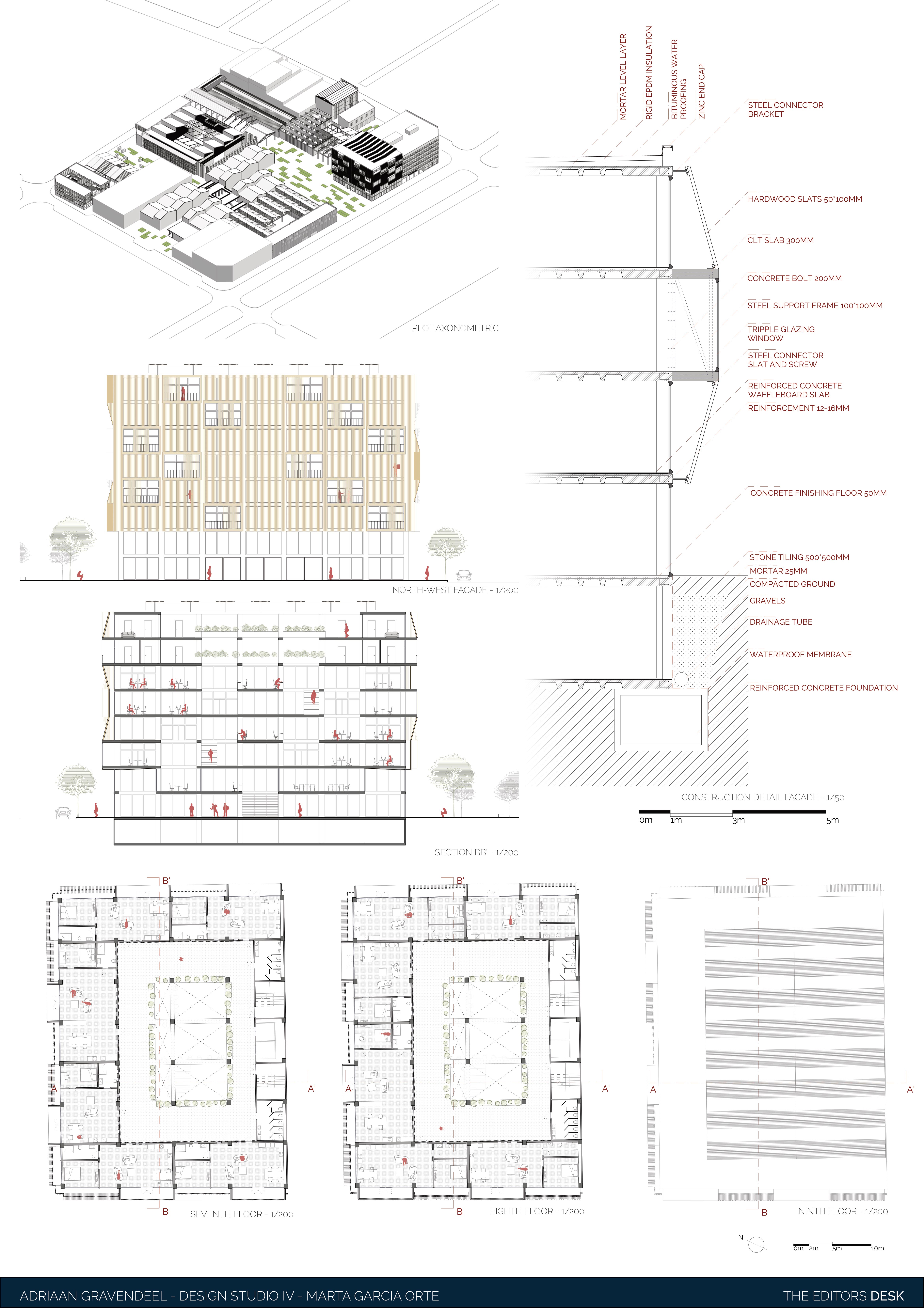 The assignment to redesign a building to a new purpose, the adaptive reuse, is always an interesting challenge. The existing structure, often contains structural elements that constrict the redesign. When successfully executed the old and new find a beautiful coexistence and give new life to the old. In this case the former office building is built around pillars connected by horizontal connecting beams, which cannot be removed. The design presented here combines residential with commercial purpose. The lower floors are to be used as head-office for a journalism firm, with a dynamic atmosphere. This is created by extending the workspace over the different floorlevels. Furthermore open spaces are created in between, which also cross the “natural” floor borders. The top the building contains the residential part of the building. It is a mix of sizes allowing for several social classes to coexist. The façade is a 3-dimensional design, to emphasize the dynamic of the redesign. It symbolizes the ever active and inquiring nature of the journalism inside.