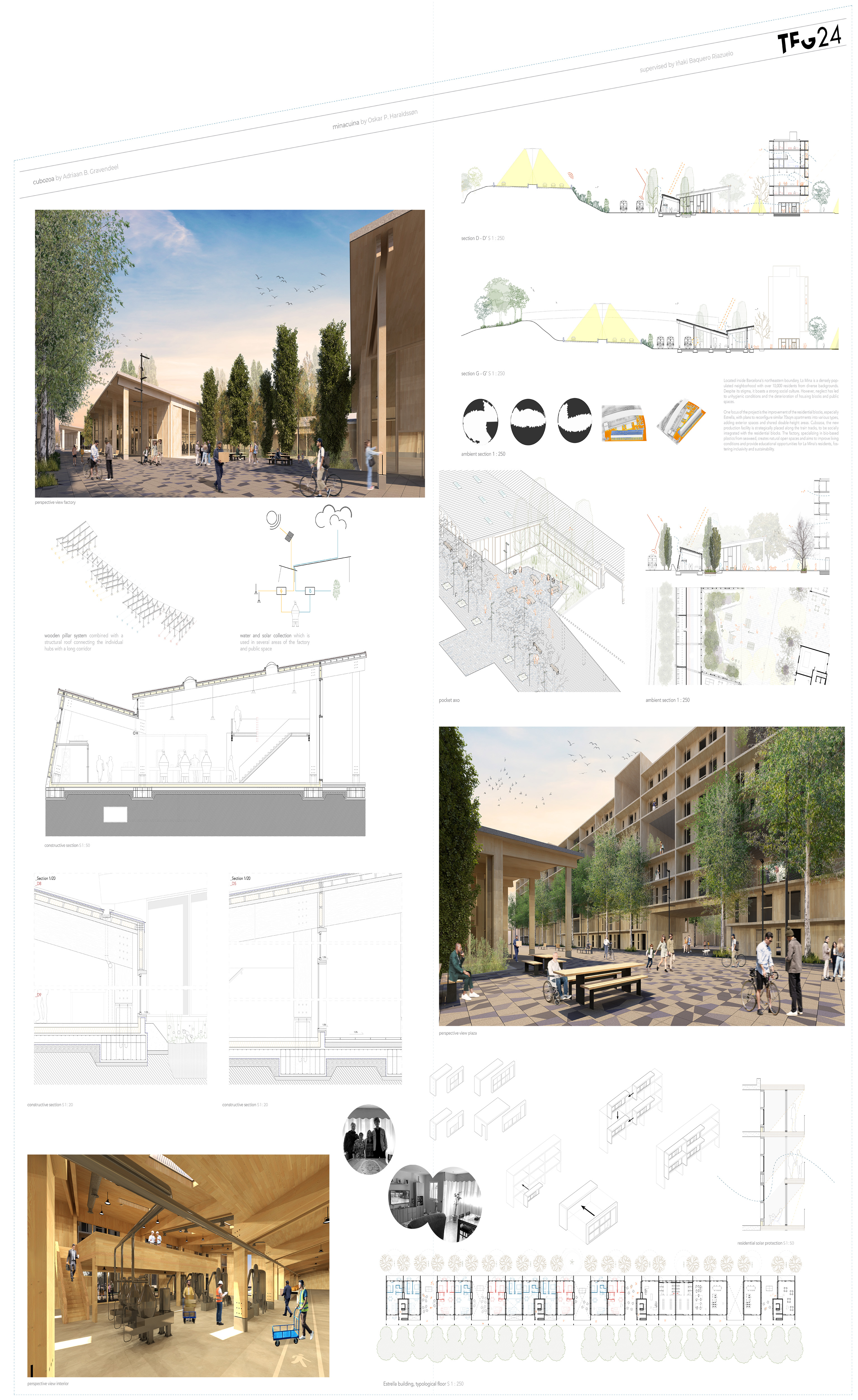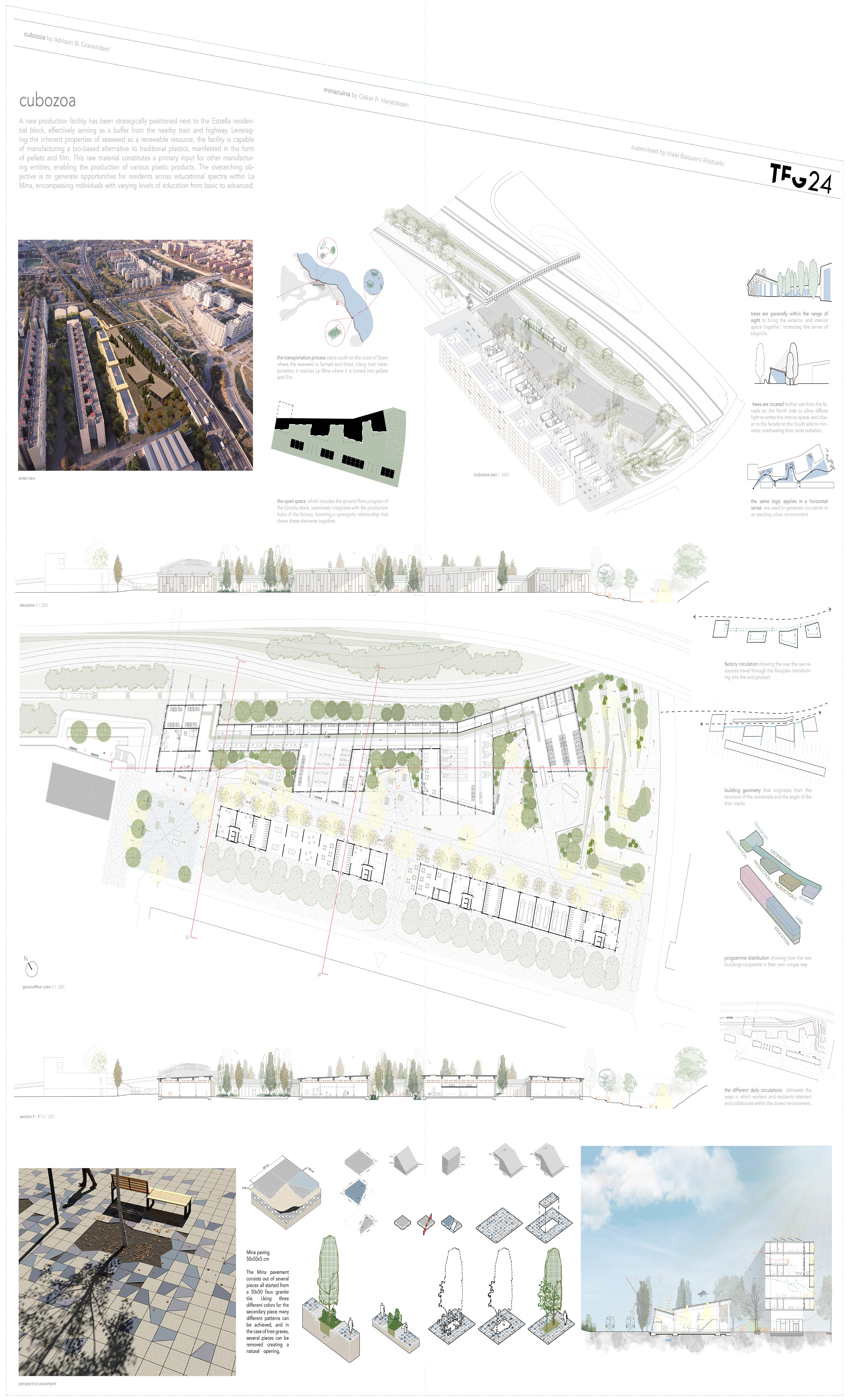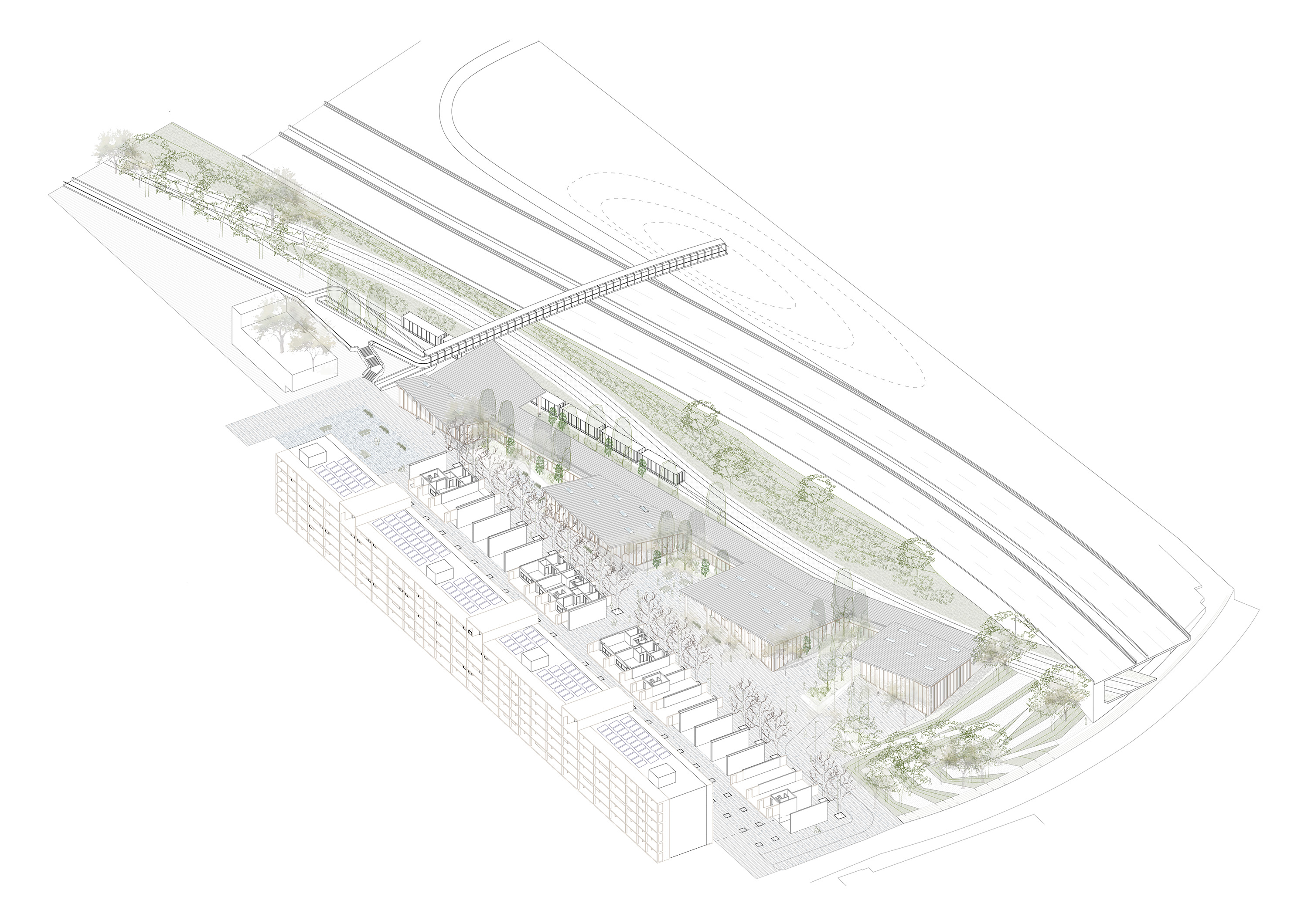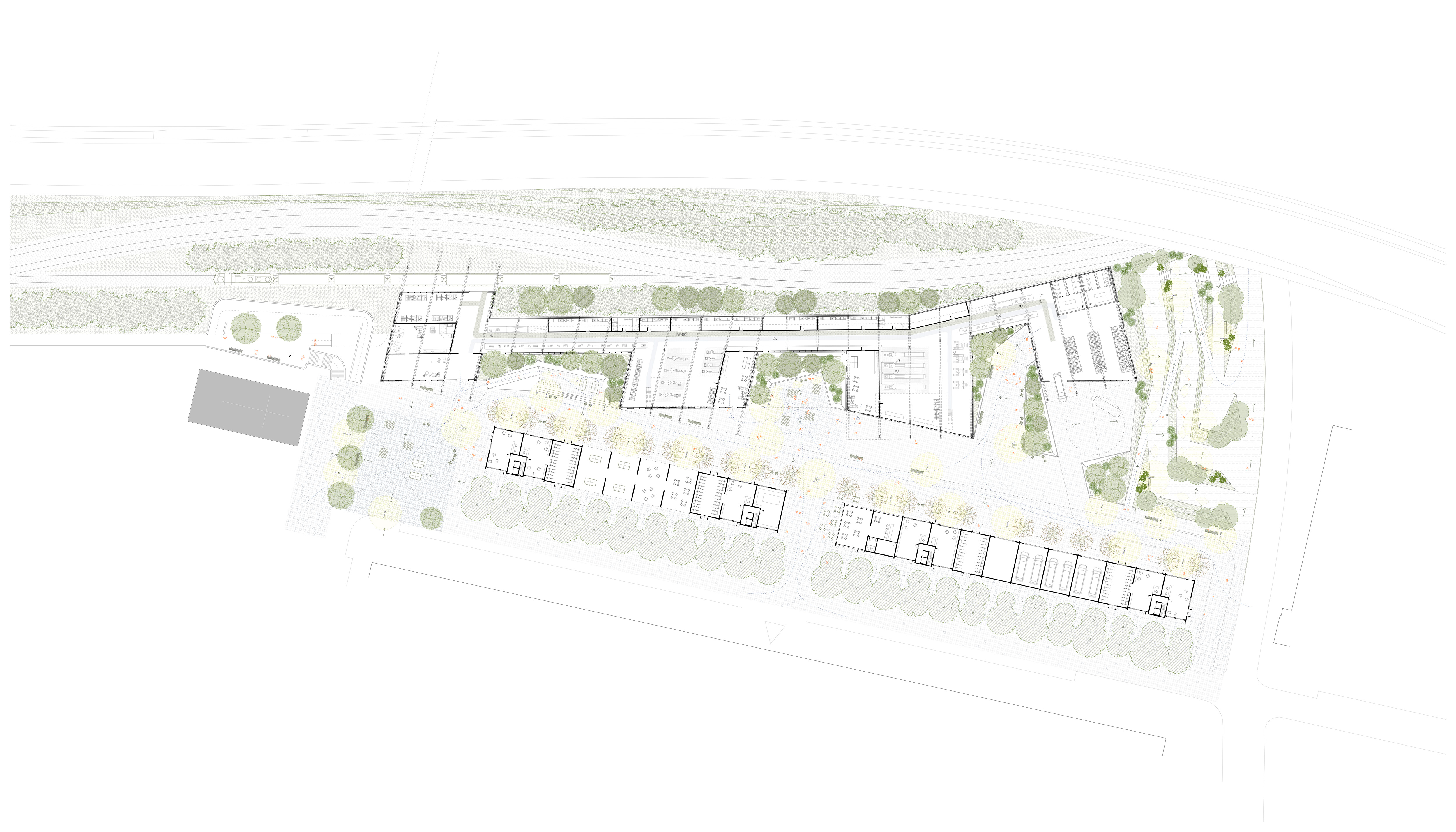 Another significant aspect of the project involved addressing the long, narrow space between the Estrella residential block, the train tracks, and the highway. A new production facility was strategically positioned in this area to serve as a buffer from the noise and activity of the train and highway. The design of Cubozoa factory, featuring a long horizontal core connecting multiple production hubs, created several interconnected natural open spaces. By integrating the first two floors of the residential blocks, they became part of the same open environment.